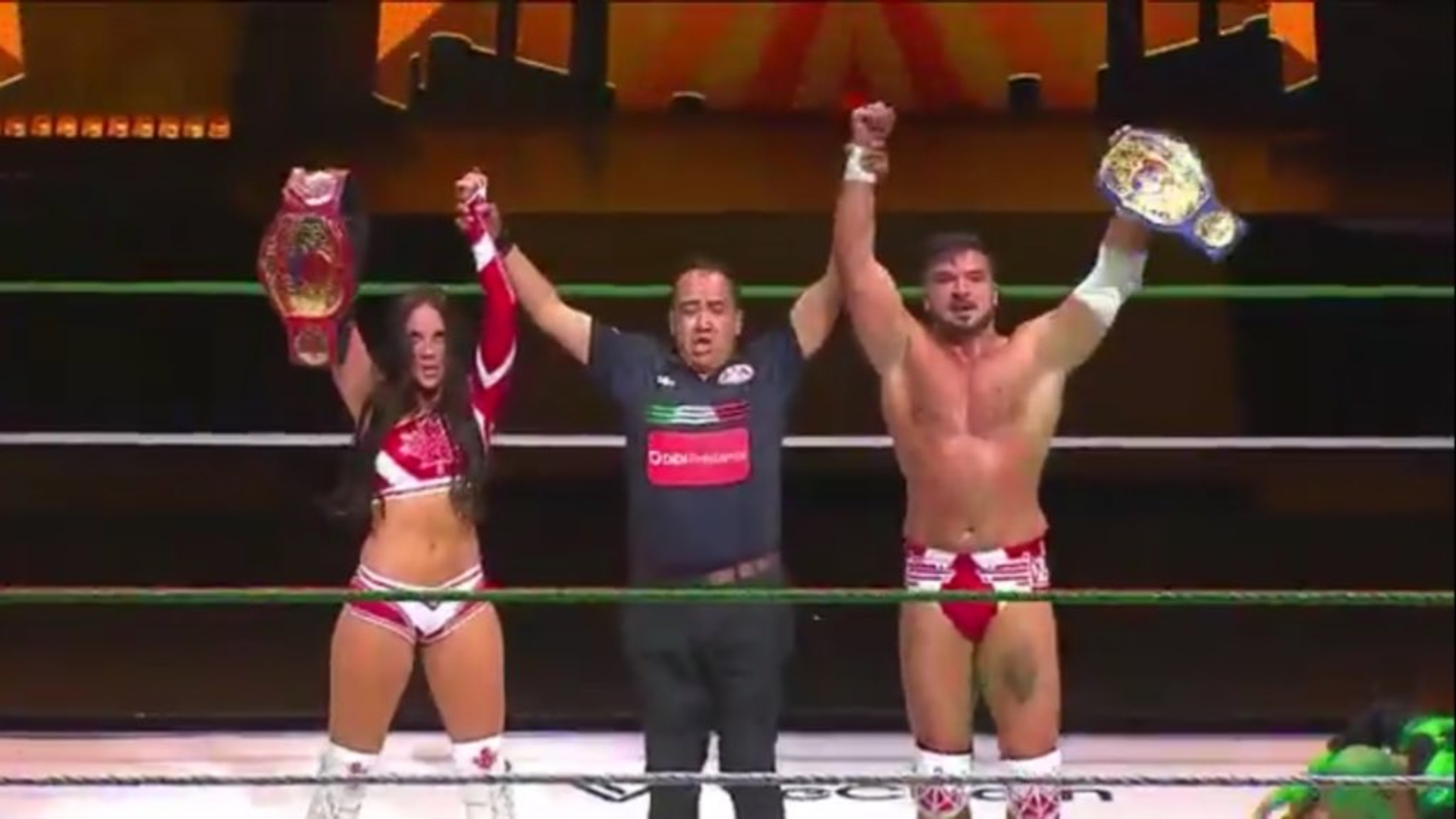 Los canadienses y superestrellas de WWE, Chelsea Green y Ethan Page, se proclamaron Campeones Mundiales de Parejas Mixtas de Lucha Libre AAA tras derrotar a La Hiedra y Mr. Iguana, cuya lucha titular se llevó a cabo en el Showcenter Complex en San Pedro Garza García, Nuevo León.