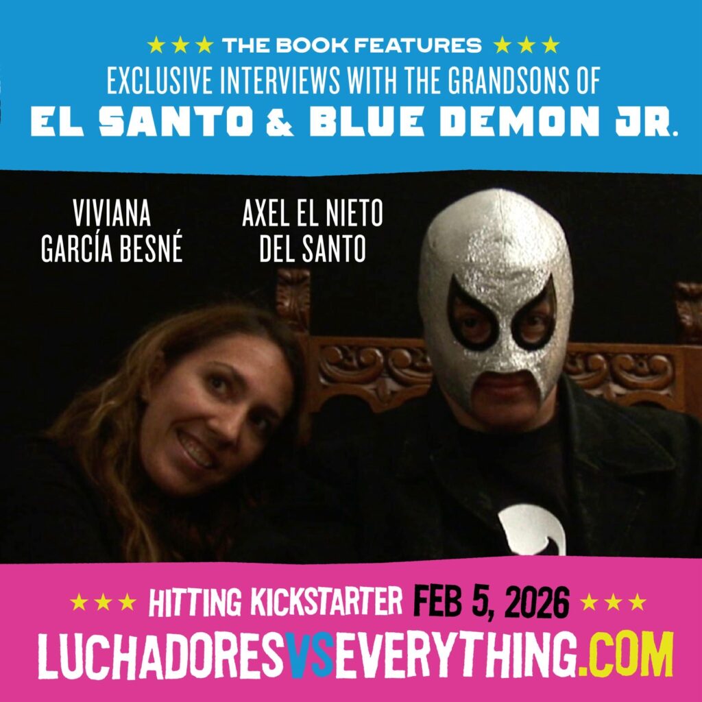 The 350+ page book dives deep into the historic vaults filled with the films of El Santo, Blue Demon, Mil Mascaras and Las Luchadoras with over 70 text and art contributors including Amy “Lita” Dumas, Hijo de Blue Demon Jr, Lee Moriarty and Rick Knox launches a Kickstarter campaign on Thursday, February 5, to create a collectors edition hardcover available worldwide.