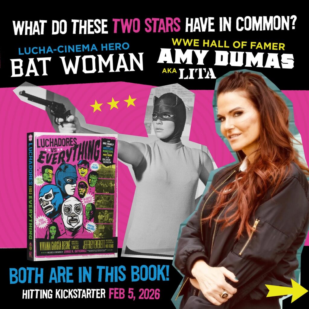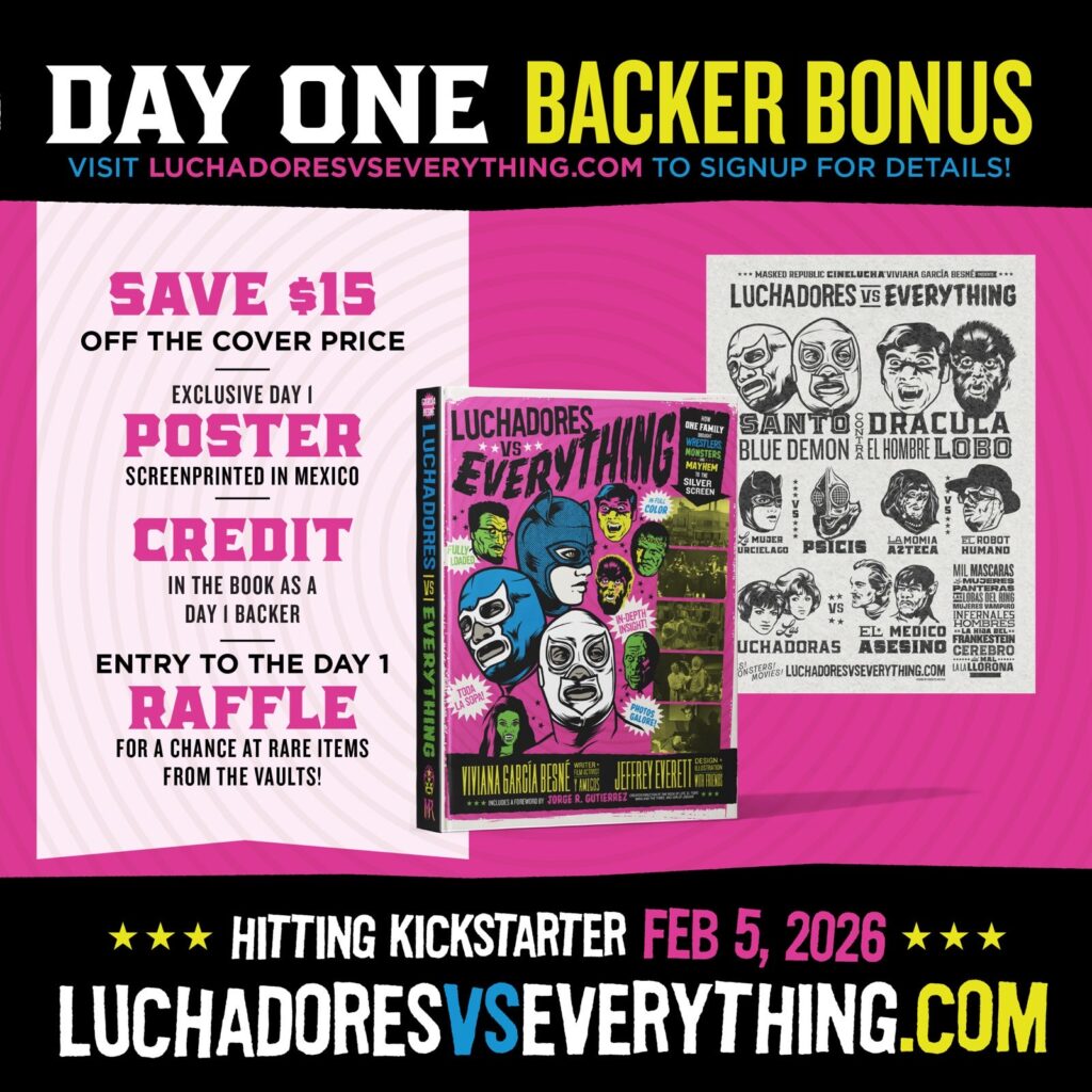 After over 18 months of work at the tail end of decades in researching for Viviana García Besné, she is ready, along with Masked Republic and award winning designer Jeffrey Everett (Rockets Are Red) to bring an amazing array of never before tales and materials from her family and their film vaults to the pages of their book Luchadores vs. Everything.